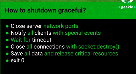 I was actually taking a screenshot of it because of the short summary about a graceful shutdown. Years later I stumbled upon this screenshot again, as a more seasoned Node developer and realized that one point in the summary was bugging me - the last line. The speaker presented it as