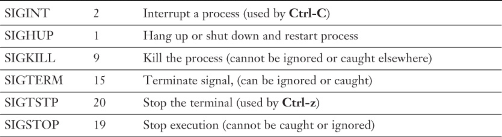 Signals, in general, are notifications sent by an operating system to processes in order to inform them about various events, including termination, interruptions, or errors. The following table provides an overview of some of the most common signals.